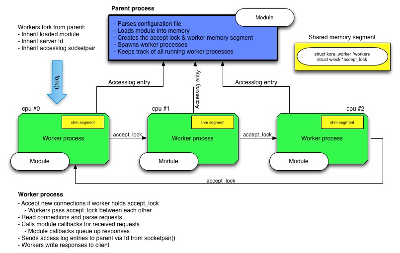 - Event driven (epoll/kqueue) architecture with per CPU worker processes